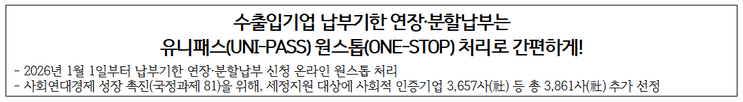 수출입기업 납부기한 연장·분할납부는 유니패스(UNI-PASS) 원스톱(ONE-STOP) 처리로 간편하게!