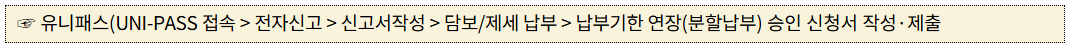 앞으로 관세청 세정지원 대상으로 선정된 기업* 및 일시적 경영 위기에 처한 기업은 전자통관시스템에서 아래 경로로 접속해 납부기한 연장과 분할납부를 간단하게 신청할 수 있으며, 심사·승인까지 원스톱(ONE-STOP)으로 처리된다.