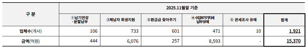 한편, 관세청은 지난해 11월 말 기준 5개 분야에서 약 2천여 개 기업에 1조 5천억 원 규모의 세정 지원을 제공했다고 밝혔다.