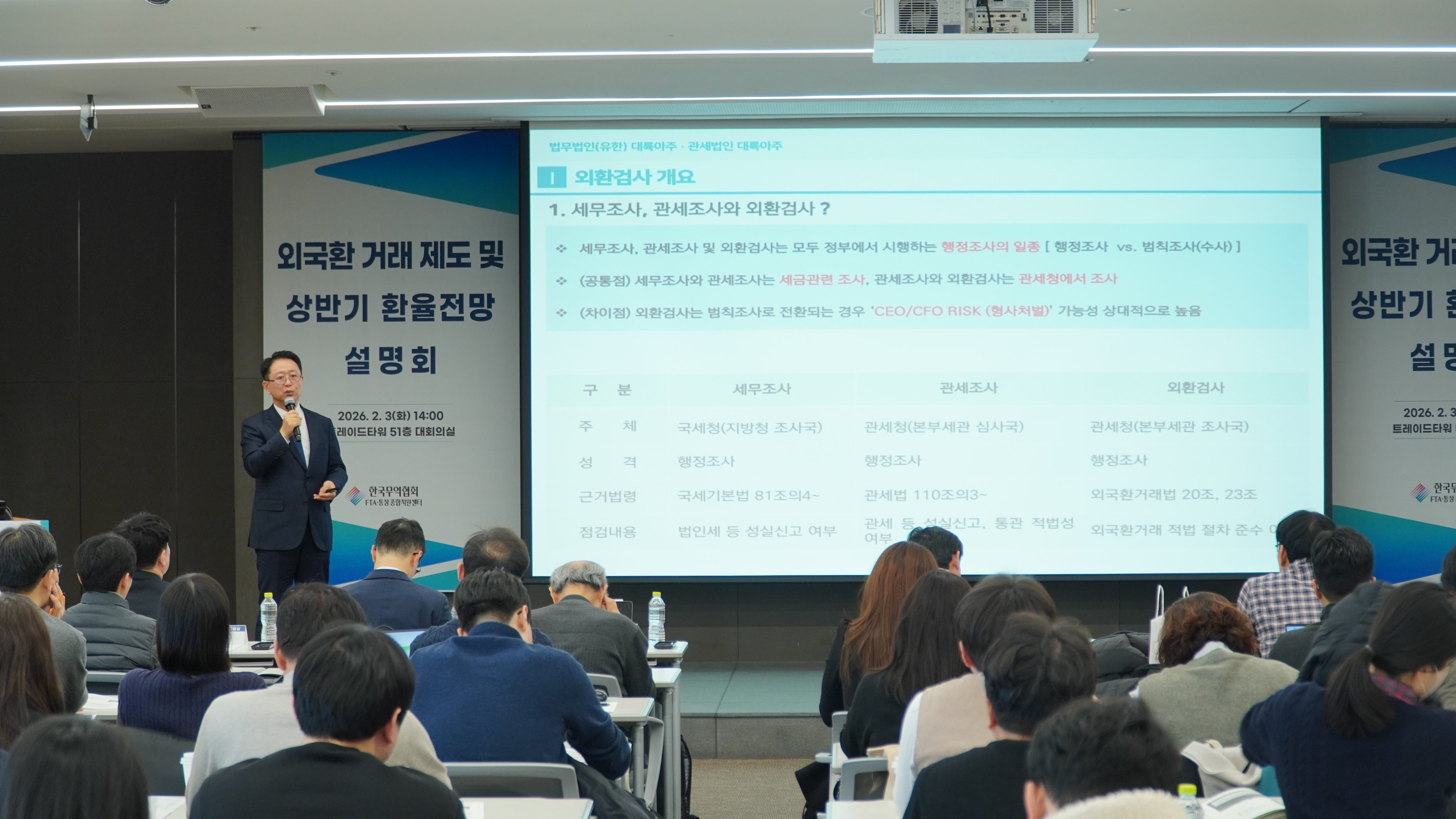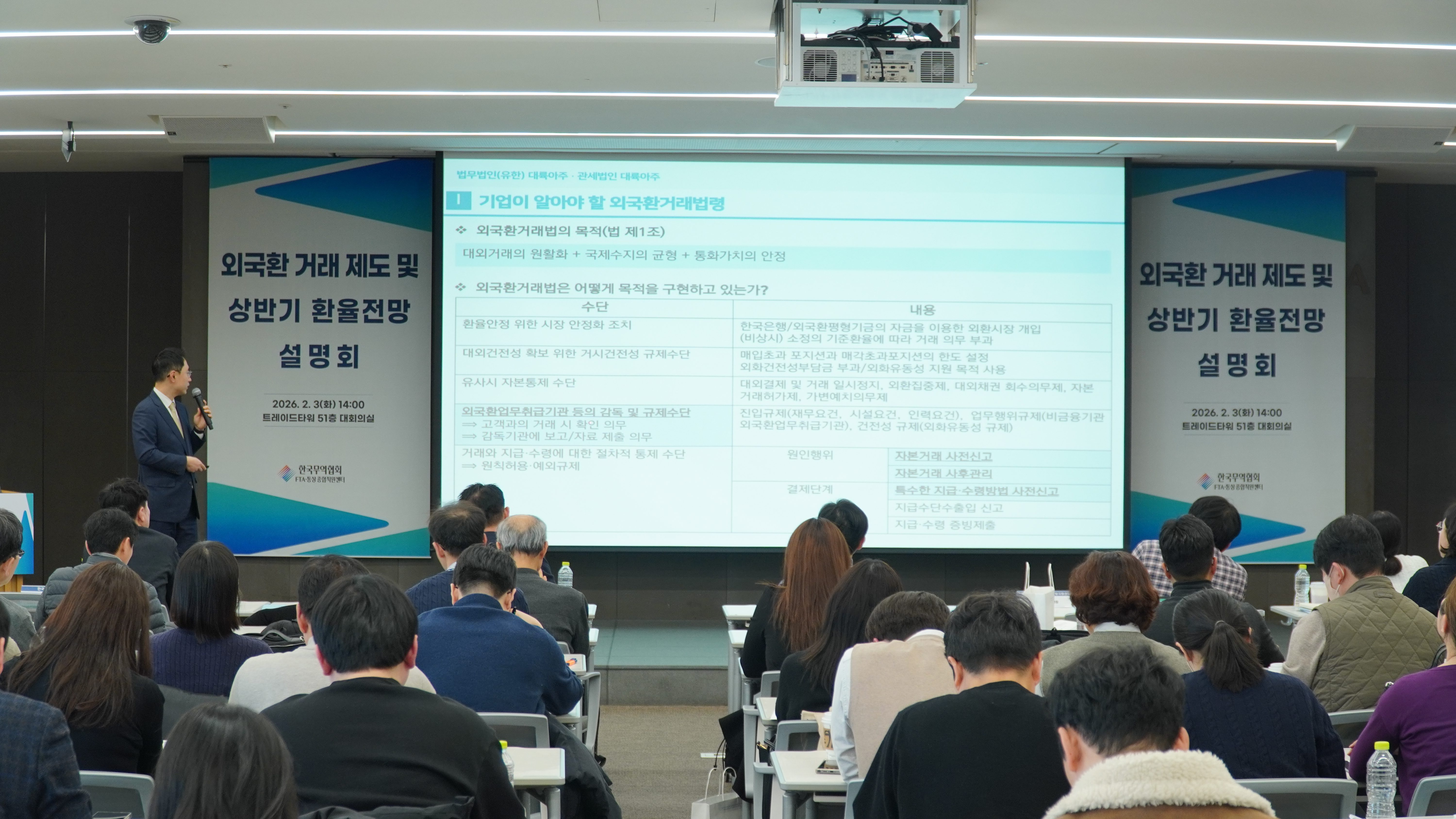 이번 설명회는 각 기업에서 외국환거래 관련 업무를 담당하고 있는 재무 및 수출입 담당자의 외국환거래법규에 대한 이해도를 높이고 향후 환율 전망과 환리스크 관리 전략을 제공하기 위해 마련되었습니다.